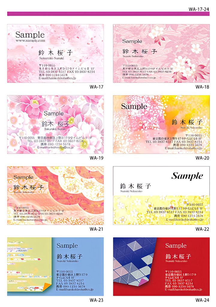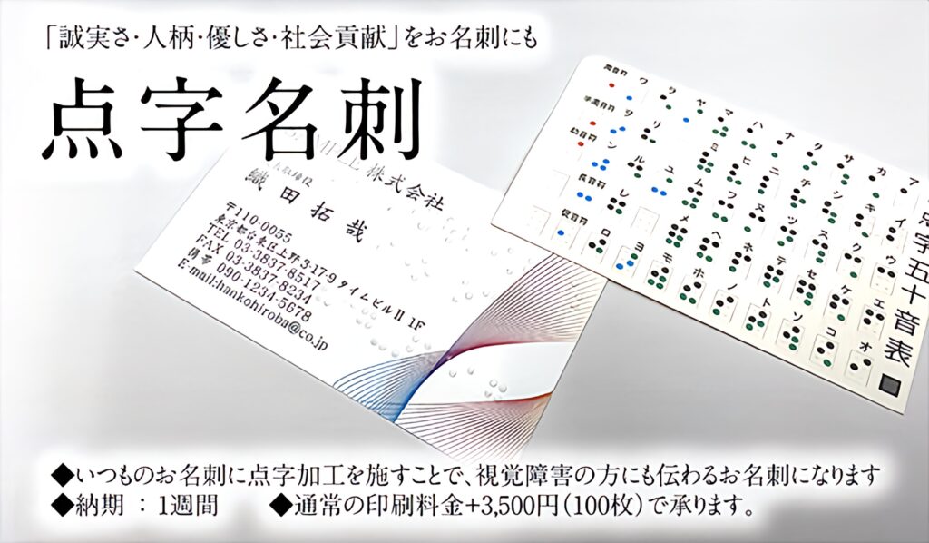 高級手漉き和紙名刺、切り抜き名刺、点字名刺など様々なオプションをご用意しています。お気軽にご相談ください。