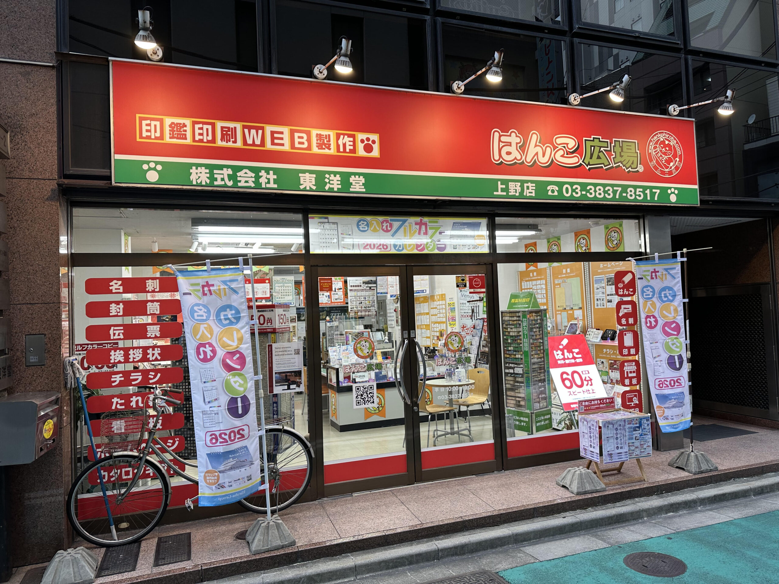 台東区上野・御徒町・湯島近郊の皆様実印・銀行印・認印・訂正印・会社の代表印・法人印・電子印鑑・ゴム印・名刺・抗菌名刺・封筒印刷・チラシ印刷・年賀状印刷・喪中葉書印刷・宛名印刷・広報誌作成各種・カタログ・はがき・DM・ポスター・自分史・製本・たれ幕・看板・プレート・のぼり・ダビング・Tシャツ・デジカメプリント・賞状印刷・名入れカレンダー・ホームページ制作・動画制作・各種販促グッズ・ノベルティグッズ・その他会社設立・開店一式等々お手伝いいたします。名刺やゴム印からチラシ・看板・カッティングシールまで 開店・開業等に関わる一式作成等、なんでもご相談ください。